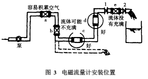 a,b,e為不宜位置(b處可能液體不充滿,a和e處易積聚氣體,且 e處傳感器后管段短也有可能不充滿);對(duì)于固液兩相流來說c處亦是不宜位置。