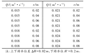 有限水域的浮體結(jié)構(gòu)在不同來流動水中運行時,浮體結(jié)構(gòu)位置的改變會對流場產(chǎn)生影響,從而影響浮體結(jié)構(gòu)的泄流能力以及穩(wěn)定性。試驗過程中固定浮體結(jié)構(gòu)的體型不變(長L=0.20m,寬B=0.30m,高a=0.10m),分別選取4種不同來流流量Q及浮體結(jié)構(gòu)位置e,控制浮體結(jié)構(gòu)在上、下游水位不變的條件下進行試驗,具體試驗參數(shù)設計及說明見表1以及圖2。
