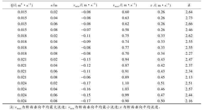 流速沿斷面分布的均勻特性可以通過流速分布不均勻系數(shù)進行表征,通過所選取斷面*大流速和*小流速的差值與該斷面平均流速的比值,δ值越大表明浮體結(jié)構(gòu)的存在對水流斷面流速的分布產(chǎn)生的影響較大。表2中,當來流流量相同時,流速的不均勻系數(shù)多數(shù)隨e的增大而減小。浮體結(jié)構(gòu)位置較小時,主流為浮體結(jié)構(gòu)上部的水流。隨著浮體結(jié)構(gòu)位置的上升,來自上游的水體逐漸分成浮體結(jié)構(gòu)上部和下部的兩股主流,流速分布的不均性減小。浮體結(jié)構(gòu)位置及所處水位條件相同時,來流流量的增大,區(qū)域的平均流速增大,因此流速不均勻性減小。