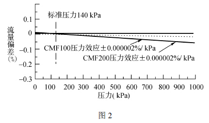 從圖2 中, 我們可以看出壓力對測量準(zhǔn)確度的影響:當(dāng)工藝壓力增大, 會使流量計產(chǎn)生一個負向偏差, 表現(xiàn)為流量顯示值比實際值偏小;當(dāng)壓力減小時, 會使流量計產(chǎn)生一個正向偏差, 表現(xiàn)為流量顯示值比實際值偏大。