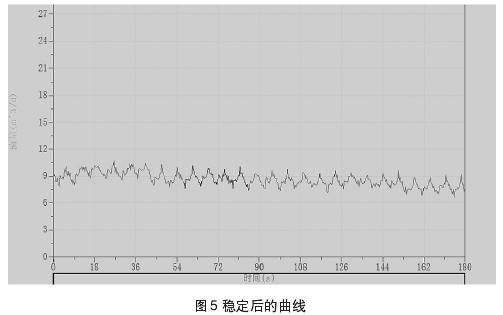 圖4、圖5中所示曲線為測量過程中所截取的集流傘中所聚集的氣相,通過排氣通道排出時與排出后的測量曲線。測試過程中錄取到的儀器排氣的過程,當集流傘完全支開后仍需要開啟流量測試進行實時檢測,否則可能會錄取資料失真。
