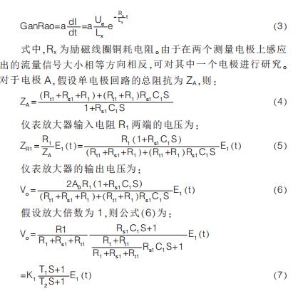 提出在硬件電路上加入模擬開(kāi)關(guān), 干擾尖峰到來(lái)時(shí)斷開(kāi)模擬開(kāi)關(guān)避免干擾進(jìn)入后級(jí)電路,尖峰過(guò)去重新打開(kāi)模擬開(kāi)關(guān);K.Saito 等提出漂移校正法,先以高勵(lì)磁頻率進(jìn)行勵(lì)磁,在勵(lì)磁過(guò)程中插入低勵(lì)磁頻率提取用于漂移校正的非固定微分噪聲分量,但在插入的低勵(lì)磁頻率段漿液噪聲較大且很難將漿液噪聲與流量信號(hào)分離,此時(shí)的校正因子非單純的非固定噪聲分量,改進(jìn)措施是長(zhǎng)時(shí)間取平均值得到穩(wěn)定因子。 傳統(tǒng)方法是同步采樣保持法,即在磁場(chǎng)穩(wěn)定階段采樣。 其他消除干擾的方法有設(shè)置干擾補(bǔ)償機(jī)構(gòu)、控制勵(lì)磁電流變化率減小干擾幅值、矩形波代替梯形波、希爾伯特黃變換結(jié)合傅里葉變換和程控增益技術(shù)等。經(jīng)上述對(duì)現(xiàn)有的文獻(xiàn)分析與總結(jié)可知, 當(dāng)前消除微分噪聲主要從信號(hào)處理方面入手,并未對(duì)影響噪聲的因素加以研究。 本文建立電極測(cè)量回路等效模型,給出仿真模型搭建、參數(shù)取值和仿真結(jié)果分析。