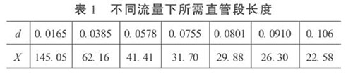 3.直管段長度和生物柴油流量計精度的初步預(yù)測在工程設(shè)計中,根據(jù)流體性質(zhì)、流量和雷諾數(shù)確定α和d值。這樣,按照式(5)就可以依不同的流量計精度要求,對直管段長度進行初步預(yù)測,或確定直管段長度后,對流量計的精度做初步預(yù)測。當(dāng)δ= 0.2%時,不同流量下所需直管段長度見表1。