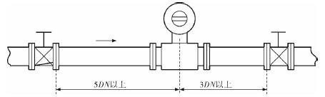 工業(yè)鹽水流量計(jì)的安裝質(zhì)量對(duì)其測(cè)量結(jié)果的影響較大,因此在安裝時(shí)需要注意幾個(gè)問題。*先,工業(yè)鹽水流量計(jì)直管段的選擇在配管時(shí)一定要按照要求進(jìn)行選擇,一般選擇流量計(jì)通徑與工藝管道通徑相同,即可滿足工程需要,而且安裝方便、壓力損失小,流量計(jì)直管段上游側(cè)的長(zhǎng)度不少于5倍工藝管道直徑,下游側(cè)的長(zhǎng)度不少于3倍工藝管道直徑(圖2)。但在流速太慢而又要求精度較高或需要變徑的應(yīng)用場(chǎng)合,可選擇通徑小于工藝管道通徑的流量計(jì),以提高測(cè)量精度,此時(shí)流量計(jì)上、下游必須加裝異徑管,且進(jìn)口異徑管上游側(cè)應(yīng)有長(zhǎng)于10倍工藝管道直徑的直管段,下游側(cè)應(yīng)有長(zhǎng)于5倍工藝管道直徑的直管段(圖3)。