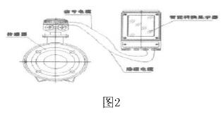 一體型管道污水流量計是由流量傳感器和轉(zhuǎn)換器(也叫顯示器)兩大部分組成。測量管上下裝有激磁線圈,通激磁電流后產(chǎn)生磁場穿過測量管,一對電極裝在測量管內(nèi)壁與液體相接觸,引出感應電勢,送到轉(zhuǎn)換器。激磁電流則由轉(zhuǎn)換器提供。如圖2所示: