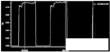 灌裝頭的*終出口部分為10~14mm的可更換縮口。通過縮口,可以產(chǎn)生背壓,一般縮口內(nèi)置蜂窩狀虹吸管,保證灌裝前后的管道滿管。從測試的流量波形上看,10mm的灌裝頭產(chǎn)生適當(dāng)?shù)淖枘嵝Ч髁壳€較穩(wěn)定。