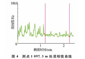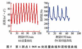 T-××-××1井是大慶油田采油五廠1口水驅(qū)產(chǎn)出井,采用阻抗式含水率計(jì)在該井進(jìn)行了測(cè)試。圖3、圖4分別為測(cè)點(diǎn)深度1097.3m測(cè)量的流量及混相值曲線圖。2min的采樣時(shí)間內(nèi),流量及混相值曲線波動(dòng)劇烈,明顯受井下產(chǎn)氣影響,進(jìn)行平均值計(jì)算時(shí)只能取后半段較平穩(wěn)的數(shù)據(jù),因此,測(cè)試時(shí)需延長(zhǎng)測(cè)量時(shí)間。錄取不同范圍數(shù)值時(shí)流量及含水率測(cè)量差值較大,流量平穩(wěn)段為14.81m3/d,高值時(shí)達(dá)到23.52m3/d;取不同測(cè)量段的混相值時(shí)測(cè)量含水率*大相差12%。重復(fù)測(cè)量得到了相同的測(cè)量結(jié)果。由此可見(jiàn),氣體對(duì)流量及含水率測(cè)量產(chǎn)生了非常大的測(cè)量誤差。