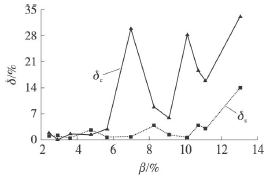 將試驗數(shù)據(jù)進行處理,得到了過熱蒸汽流量計測量誤差隨氣相含率變化的情況,如圖5所示。其中δs為譜分析方法的測量誤差,δc為脈沖計數(shù)方法的測量誤差。過熱蒸汽流量計的測量誤差用式(4)來計算。其中Qs為裝置中標準表測量出的管道總流量,Qt為試驗管段中過熱蒸汽流量計的測量值。將譜分析和脈沖計數(shù)得到的頻率值和儀表系數(shù)分別代入式(5)計算Qt值。從圖中可以看出氣相含率的增加兩種測量方法得到的誤差并不相同。當含氣率不高時,0<β<6%,譜分析法的平均誤差為1.226%,*大誤差為2.687%,脈沖計數(shù)法的平均誤差為1.583%,*大誤差為2.898%,因此譜分析法與脈沖計數(shù)法的測量誤差區(qū)別不大,譜分析沒有明顯的優(yōu)勢;在氣相含率進一步增加時,6%<β<14%,譜分析法的平均誤差為3.975%,*大誤差為14.058%,脈沖計數(shù)法的平均誤差為20.053%,*大誤差為33.130%,脈沖計數(shù)的方法得到的測量誤差遠大于譜分析方法。