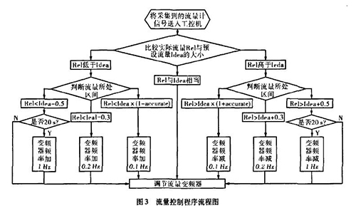 實(shí)際生產(chǎn)中流量一直在某個(gè)區(qū)域內(nèi)波動(dòng),且其動(dòng)態(tài)特性不易掌握。從上面的理論中我們能夠讓誤差△£盡可能的小,這樣距我們所需要的理論值%就越接近。而減小誤差需要我們把n取的盡可能大,也就是在生產(chǎn)時(shí)間內(nèi)劃分更多的周期去調(diào)節(jié)流量。當(dāng)工控機(jī)根據(jù)堿性污水流量計(jì)傳送回來的信號(hào)發(fā)出調(diào)節(jié)變頻器工作頻率的指令后,電機(jī)調(diào)整功率到堿性污水流量計(jì)的實(shí)際測量為一個(gè)工作周期,我們知道從指令發(fā)送到實(shí)際測量值返回有一個(gè)較大的滯后,如果調(diào)節(jié)的周期時(shí)間小于流量計(jì)本身的一個(gè)工作周期,那么顯然不可能達(dá)到減小誤差的目的。利用模糊控制思想H。,在控制程序中我們把流量的波動(dòng)區(qū)域劃分為±缸×Yo,Yo-t-O.3,Yo±0.5四個(gè)區(qū)域,其中缸為可調(diào)節(jié)的誤差范圍,生產(chǎn)中我們?nèi)?.015,流量區(qū)域劃分的單位均為t/h。針對(duì)不同的區(qū)域采取不同的調(diào)整方案。具體流程如圖3所示。圖中變量Rel表示實(shí)際測量的流量,變量Idea表示理論流量。