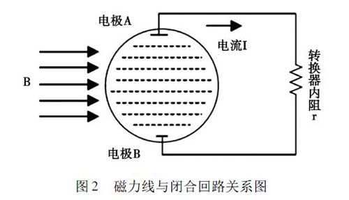 2. 1 正交干擾鹽水流量計(jì)的磁路系統(tǒng)包含有兩個(gè)勵(lì)磁線圈,而導(dǎo)管內(nèi)的液體與傳感器電極及轉(zhuǎn)換器結(jié)構(gòu)組成了一個(gè)閉合的回路,如圖2 所示。理論情況下,磁力線( 圖中B) 應(yīng)與閉合回路相平行,但是由于裝配過程中的誤差,導(dǎo)致磁力線不可能完全平行于這一閉合回路,出現(xiàn)部分磁力線成一定角度穿過回路的現(xiàn)象,這引起了即使沒有液體流動(dòng)的情況下,傳感器的電極上也會(huì)產(chǎn)生感應(yīng)電動(dòng)勢(shì),就形成了正交干擾的基本形式。