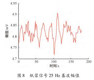 在頻域中對紙漿信號觀察時發(fā)現(xiàn),紙漿信號的漿液噪聲頻帶在零頻率點附近,距離流量信號基波頻率點較遠,對基波幅值和各奇次諧波幅值基本沒有影響,紙漿信號在頻域中的圖形如圖7所示。選擇一組采集的紙漿信號,把其等分成數(shù)段,利用MATLAB計算每段數(shù)據(jù)在基波處的幅值并提取保存在一個數(shù)組中,使用繪圖工具畫出來,如圖8所示??梢?,基波幅值在4.7~4.95mV變化,波動較小。因此,提取到的與流量相關的感應電動勢信號幅值會比較穩(wěn)定。