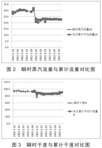 根據(jù)錐型孔板流量計在稠油 SAGD 的應(yīng)用數(shù)據(jù),將瞬時蒸汽流量與累計平均流量、瞬時干度與累計平均干度、瞬時蒸汽流量與鍋爐流量、累計平均流量與鍋爐流量、瞬時干度與鍋爐干度、累計平均干度與鍋爐干度、瞬時流量誤差與累計流量誤差、瞬時干度誤差與累計平均干度誤差繪成散點圖(圖 2 - 圖 5)。