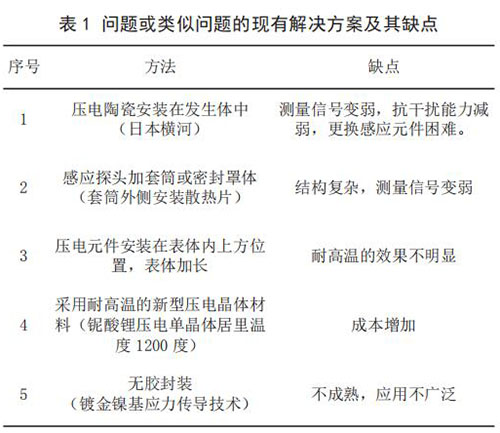 3) 當(dāng)前技術(shù)系統(tǒng)存在的問題。 由于目前使用的傳感器檢測(cè)感應(yīng)元件為壓電陶瓷,其極化時(shí)居里溫度大約420 ~ 460℃,因此只能在低于 240℃介質(zhì)中使用,一旦被測(cè)量介質(zhì)的溫度高于 240℃,二氧化硫流量計(jì)傳感器便會(huì)因壓電陶瓷達(dá)到居里點(diǎn),絕緣電阻降低,壓電信號(hào)變?nèi)醵А?br /> 4)問題或類似問題的現(xiàn)有解決方案及其缺點(diǎn)(見表 1)。
