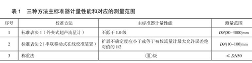 本規(guī)范包含三種校準方法,分別為標準表法 1(外夾式超聲流量計)、標準表法 2(串聯移動式在線校準裝置)和稱重法,編制組對每種方法進行了大量的實驗,并積極與管道式流量計生產廠家及用戶溝通探討,積累了豐富的經驗,獲得了大量的實驗數據,*終確定三種方法的主標準器計量性能和對應的測量范圍,如表 1 所示。