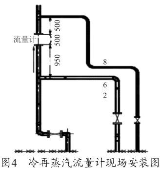 根據(jù)圖1渦街流量安裝要求示意圖及廠(chǎng)家的設(shè)備說(shuō)明書(shū)要求,流量計(jì)上游的直管段長(zhǎng)度至少為20D≈1 300mm,下游的直管段至少在5D≈325mm,D=65mm 為管道直徑。圖4為冷再蒸汽流量計(jì)現(xiàn)場(chǎng)安裝圖,流量計(jì)上游僅為950mm<1600mm,此流量計(jì)安裝位置有誤,對(duì)測(cè)量值有一定的影響,造成測(cè)量偏差,需調(diào)整流量計(jì)的安裝位置。