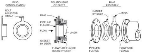 對于接地環(huán)應(yīng)用,如果使用傳統(tǒng)的孔板式或C型接地環(huán),則必須使用接地帶將接地環(huán)連接到流量管的主體/外殼。這些帶子連接到流量管的法蘭上,或接地線連接到位于其遠程接線盒或頂部安裝的變送器接口板上的接線片上。E型接地環(huán)使用客戶提供的螺栓,而不是接地線或接地帶。