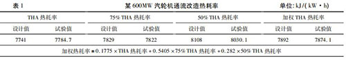 隨著火電機(jī)組利用小時數(shù)降低,發(fā)電企業(yè)一般都會根據(jù)不同負(fù)荷工況下的實際運(yùn)行小時數(shù),確定機(jī)組熱耗率考核權(quán)重,形成*終的加權(quán)熱耗率考核值。考核加權(quán)熱耗率對設(shè)備廠家末級葉片選型、高壓調(diào)門與高壓缸匹配性提出了更高的要求,在當(dāng)前負(fù)荷率偏低的情況下增強(qiáng)了發(fā)電企業(yè)的競爭力。然而,僅僅對加權(quán)熱耗率進(jìn)行考核是不夠的,設(shè)備廠家為了增強(qiáng)自身的競爭力,往往會把全部重點放在如何降低占比大的低負(fù)荷熱耗率上而犧牲高負(fù)荷的熱耗率,這無疑削弱了發(fā)電企業(yè)的適應(yīng)性。某廠一臺 600MW 汽輪機(jī)通流改造時僅對加權(quán)熱耗率進(jìn)行考核,THA 熱耗率要高出設(shè)計值43. 7 kJ/( kW·h) ,詳見表 1。通流改造時既要對加權(quán)熱耗率進(jìn)行考核,也要對 THA工況時熱耗率進(jìn)行考核。