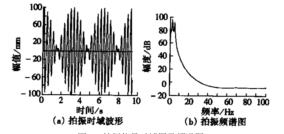 當(dāng)ω1-ω2趨近于0時,即兩個信號的頻率越接近時,拍振幅值越大。拍振信號的時域波形及頻譜圖如下,在頻譜圖中可看到兩個頻率接近的峰。