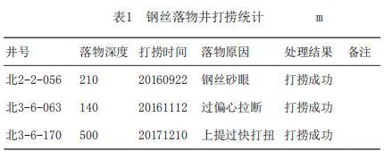 表1為一體式渦街流量計打撈統(tǒng)計表,可以看出自2016年9月開始即在現(xiàn)場進(jìn)行了應(yīng)用。為了展示試驗成果的普遍性,分別從不同注入方式、不同落物深度、不同落物原因的角度,共應(yīng)用3口鋼絲落物井,打撈成功為100%。