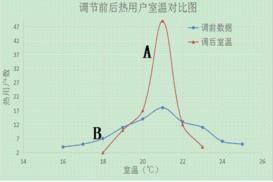 我公司在該小區(qū)管網(wǎng)改造前,在不同單元不同樓層分別安裝100臺室溫采集器。渦街流量計調前數(shù)據(jù)采集于2017~2018年供熱期,調后數(shù)據(jù)采集于2018~2019年供熱期。經(jīng)過兩個采暖期,共有96臺室溫采集器可以正常提供數(shù)據(jù)。數(shù)據(jù)分析結果見圖3所示。