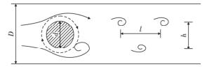 渦街氣體流量計是由漩渦發(fā)生體、頻率檢測器和信號轉換器等環(huán)節(jié)組成,輸出 4 ~ 20 mADC 信號或脈沖電壓信號。其測量原理是在流動的流體中的垂直流動方向安放 1 根或多根非流體型阻流體,在一定的流量范圍內,流體在阻流體兩側交替地分離、釋放出 2 串頻率正比于管道內的平均流速、規(guī)則的、不對稱有規(guī)律的交替漩渦列,如圖 1 所示,且兩側漩渦旋轉方向相反 。采用檢測元件測出漩渦頻率就可以推算出流體的流量。