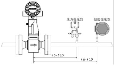 渦街氣體流量計的口徑如果與工藝管道相同,不能滿足流量儀表要求時,或者在此流速下測量準確度不能保證時,需要縮小儀表口徑,從而提高管內流速,保證測量精度。上下游必須有足夠的直管段,若傳感器安裝點的上游在同一平面上有 2 個 90°彎頭時,上游直管段≥25D,下游直管段≥5D。根據(jù)測量的需要,需在渦街氣體流量計附近測量壓力和溫度時,測壓點應在傳感器下游的(3 ~5)D 處,測溫點應在傳感器下游的(6 ~8)D 處,如圖 3 所示。