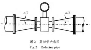 (12)當(dāng)管道內(nèi)流速偏低,工藝流量又較穩(wěn)定,為滿足儀表對流速范圍的要求,在儀表部分局部提報(bào)流速,可選擇流量計(jì)口徑小于工藝管道,并在流量計(jì)的前后加接異徑管。為了在安裝異徑管后不過多影響流場分布,不影響污水流量計(jì)的精度,要求異徑管的中心錐角α不大于15°,越小越好。這樣可把異徑管視為直管段的一部分。
