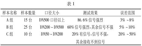 通過大量的在線檢測試驗(yàn),可以看出所測管道管徑對超聲流量計測試效果有明顯影響。根據(jù)數(shù)據(jù)顯示,管徑越大,測試效果越好,示值誤差越小。隨著管徑的減小,超聲流量計所能檢測到的流速信號也隨著變?nèi)酰?dāng)口徑小于 DN50 時,基本沒有信號或是產(chǎn)生巨大的干擾信號。