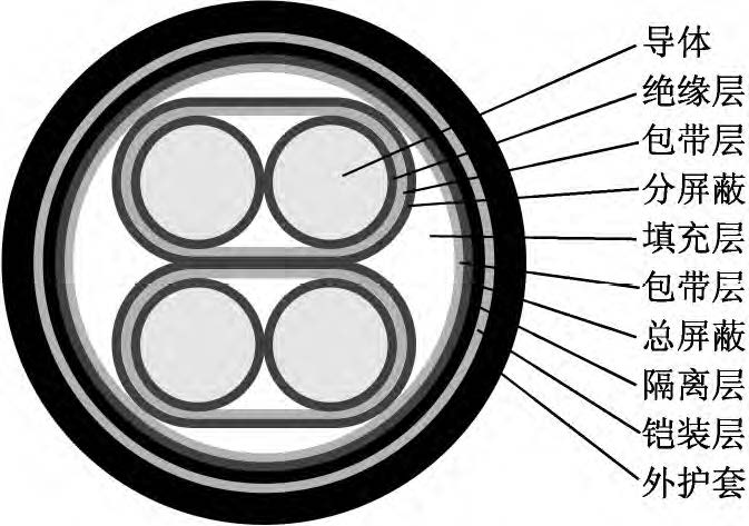 該新型電纜的結(jié)構(gòu)如圖1所示。導(dǎo)體為單股退火鍍錫軟銅線,以提高導(dǎo)體的導(dǎo)電性和防腐蝕性。在導(dǎo)體外繞包一層薄F4(聚四氟乙烯)半導(dǎo)電帶,有利于降低導(dǎo)體和絕緣之間的摩擦起電噪音。絕緣采用材料較為純凈、介電常數(shù)較小、具有一定彈性的聚丙烯絕緣級材料,并采用擠壓式擠出,減小絕緣層與導(dǎo)體的間隙。采用對絞組作為信號傳輸線,由于在兩根傳輸線上感應(yīng)的電壓接近相等,減小了電壓差值,提高了信號傳輸穩(wěn)定性;對絞組由兩種不同顏色絕緣線芯組成,相鄰線對對絞節(jié)距應(yīng)不大于100mm。對絞分屏蔽組(即對對絞組進(jìn)行分屏蔽,每對對絞組外繞包兩層聚酯帶和一層厚0.04mm鋁塑復(fù)合帶繞包,內(nèi)置一根7×0.26mm鍍錫銅絞線作引流線)有利于對不同對絞組之間信號串音的抑制和隔離。對絞分屏蔽組同心式絞合成纜,在對絞分屏蔽組間填充非吸濕性材料,以保證纜芯圓整。在成纜纜芯外繞包兩層聚酯帶,再采用鋁塑復(fù)合帶繞包,內(nèi)置鍍錫銅線作引流線,以提高電纜電磁屏蔽能力。總屏蔽層外擠包隔離層(隔離護(hù)套),隔離層采用絕緣級低密度聚乙烯材料。隔離層外采用鎧裝層,鎧裝材料為高導(dǎo)磁合金鋼帶,其為強(qiáng)磁材料,可將外來的磁通大部分限制在鎧裝層的外表面上(僅有少部分能進(jìn)入被屏蔽的空間);鎧裝時對高導(dǎo)磁合金鋼帶采用縱包焊接,確保其形成一連續(xù)圓柱管;鎧裝層可提高電纜抗電磁干擾水平以及對電纜進(jìn)行加強(qiáng),減少電纜振動引起的電動勢。外護(hù)套采用藍(lán)色軟PVC(聚氯乙烯)護(hù)層級電纜材料擠包,實(shí)現(xiàn)電纜防護(hù)。