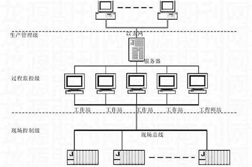 針對鎢礦選廠生產的實際需求,這里應用相應的自動化技術,對自動化監(jiān)控系統進行了設計。在系統設計中,遵循“方案合理、技術先進、運行可靠、操作方便”的原則,系統整體采用集散控制系統,基于現場總線通訊,其整體網絡構架如下:
