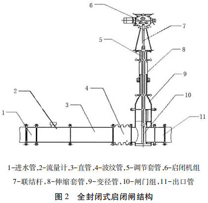 包括進水管、直管、出水管、過熱蒸汽流量計組和啟閉機組,進水管、直管、出水管從左到右依次連接,過熱蒸汽流量計組安裝在直管和出水管之間且位于出水管的入口處,過熱蒸汽流量計組通過聯(lián)結(jié)桿與啟閉機組的輸出端連接。為防止泥沙淤積影響啟閉,過熱蒸汽流量計采用閘板式啟閉結(jié)構(gòu)。密封式啟閉閘為整體封閉管道式,全部采用不銹鋼材料,水流通過管道流出讓整個閘井內(nèi)干燥無水。伸縮套管與波紋管的設計讓檢修與清理淤泥更加方便。過熱蒸汽流量計裝有荷載限制器,其布置受力明確、結(jié)構(gòu)緊湊、動作可靠。當?shù)蹙呱系暮奢d達到額定值的 110%時,或電機電流超過額定電流 150%時,系統(tǒng)自動切斷操作電源以保護設備安全。