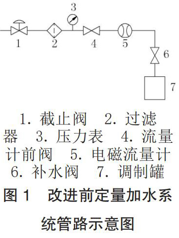 工廠的香料廚房系統(tǒng)為國(guó)內(nèi)煙機(jī)公司 2004 年設(shè)計(jì)制造,其定量加水系統(tǒng)主要由水源、管道電磁流量計(jì)、加水管路元件和控制程序這四部分組成,改進(jìn)前管路示意圖如圖 1 所示。