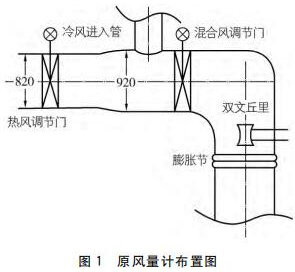 從流量測量角度講,影響流場的主要為熱風(fēng)調(diào)門、擴管、彎頭以及一次冷風(fēng)的混入,閘板門和混合風(fēng)調(diào)門由于運行時處于全開狀態(tài),影響可忽略,目前使用了單點雙文丘里管的測量方式,有以下問題: