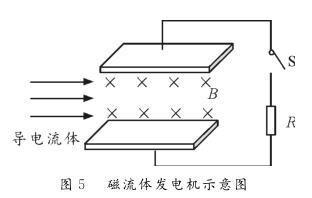 【例1】圖5為磁流體發(fā)電機(jī)示意圖。設(shè)兩金屬板間的距離為d,兩極板間勻強(qiáng)磁場(chǎng)的磁感應(yīng)強(qiáng)度為B。等離子體垂直進(jìn)入磁場(chǎng)的速度為v,單個(gè)離子所帶的電荷量為q。離子通道(即兩極板內(nèi)所圍成的空間)的等效電阻為r,負(fù)載電阻為R。則下列判斷正確的是( )