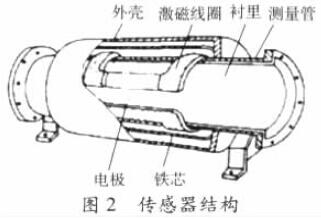 液體流量計(jì)由流量傳感器和轉(zhuǎn)換器兩部分組成。傳感器典型結(jié)構(gòu)示意如圖2,測量管上下裝有激磁線圈,通激磁電流后產(chǎn)生磁場穿過測量管,一對電極裝在測量管內(nèi)壁與液體相接觸,引出感應(yīng)電勢,送到轉(zhuǎn)換器。激磁電流則由轉(zhuǎn)換器提供。