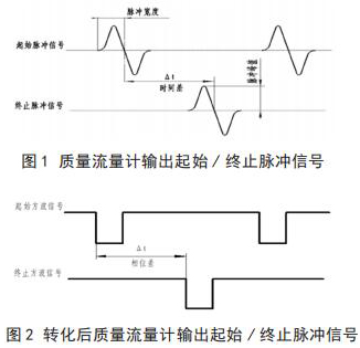 將智能型電磁流量計(jì)流量與相關(guān)測試設(shè)備連接起來,就可以進(jìn)行智能型電磁流量計(jì)的校準(zhǔn),時(shí)間差△ t 由專用試驗(yàn)測試設(shè)備可以測出。起始脈沖信號和終止脈沖信號如圖 1 所示。經(jīng)過專用試驗(yàn)測試設(shè)備信號轉(zhuǎn)化后的信號方波如圖 2 所示。