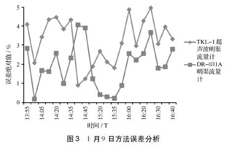 見(jiàn)圖3,以手工實(shí)測(cè)液位高度為基準(zhǔn),2種流量計(jì)的誤差均在±5%的范圍內(nèi)。除在1月9日14:40和14:45兩個(gè)時(shí)間點(diǎn)測(cè)量值表現(xiàn)出DR-831A測(cè)量誤差高于TKL-Ⅰ外,其他時(shí)段都明顯表現(xiàn)出DR-831A測(cè)量誤差小于TKL-Ⅰ。